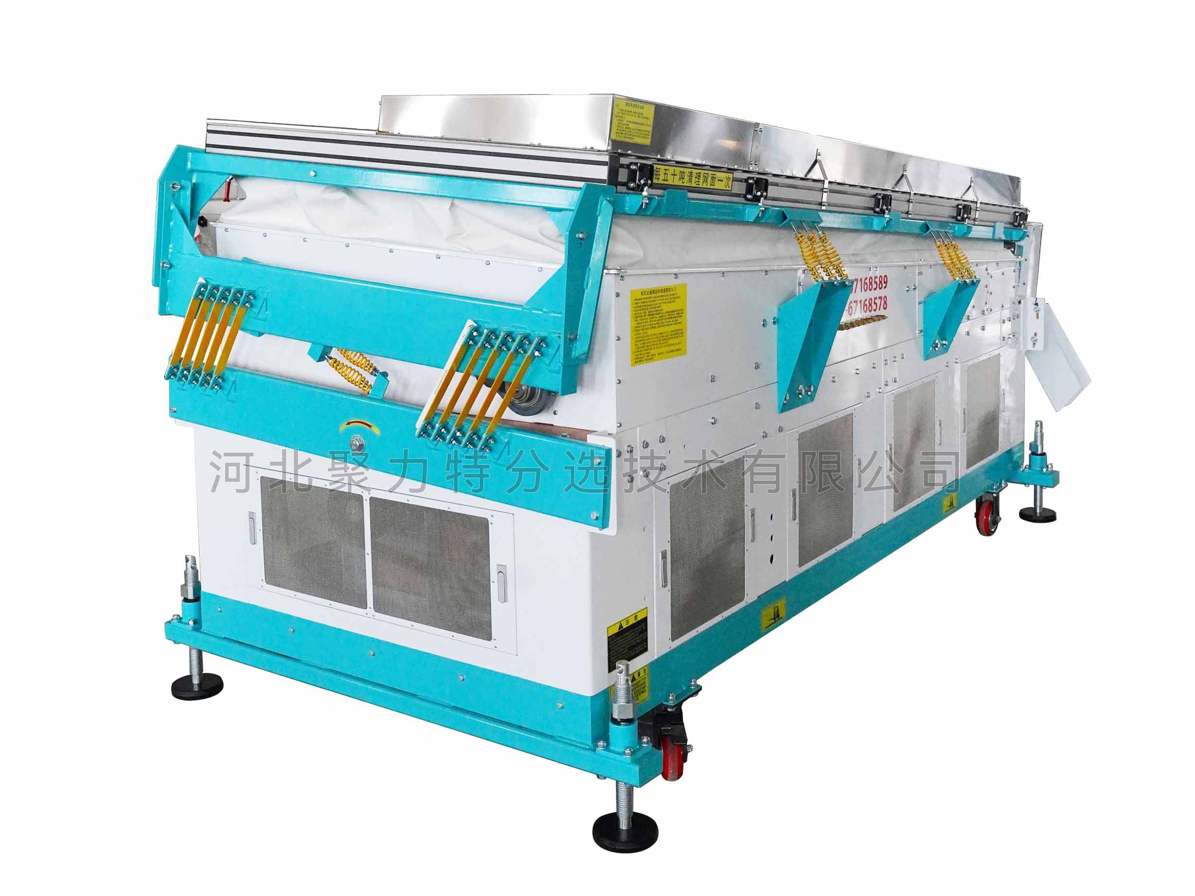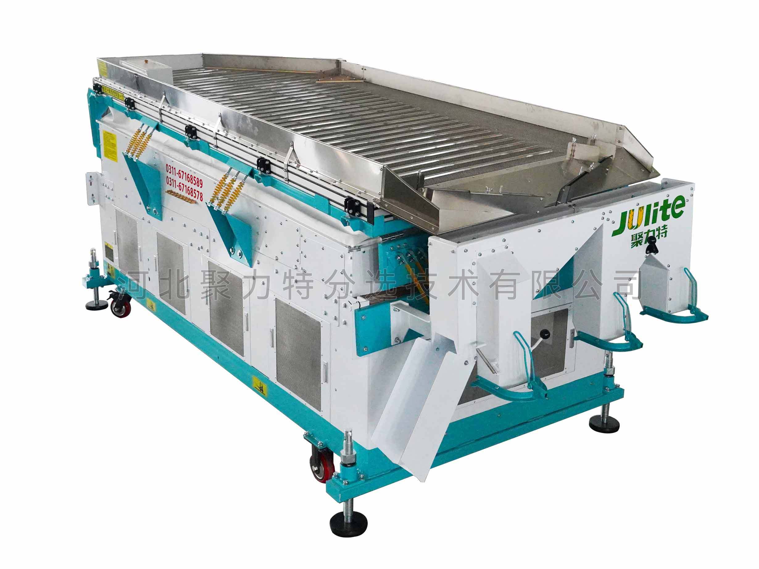 根據(jù)物料在空氣動(dòng)力和振動(dòng)摩擦力雙重作用下產(chǎn)生比重偏析的原理。通過(guò)調(diào)整風(fēng)壓、振動(dòng)頻率等技術(shù)參數(shù),使比重較大物料沉到底層,靠振動(dòng)篩面產(chǎn)生的摩擦力向高處運(yùn)動(dòng),比重較小的物料經(jīng)氣流作用懸浮在表面向低處流動(dòng),以達(dá)到按比重分離的目的。