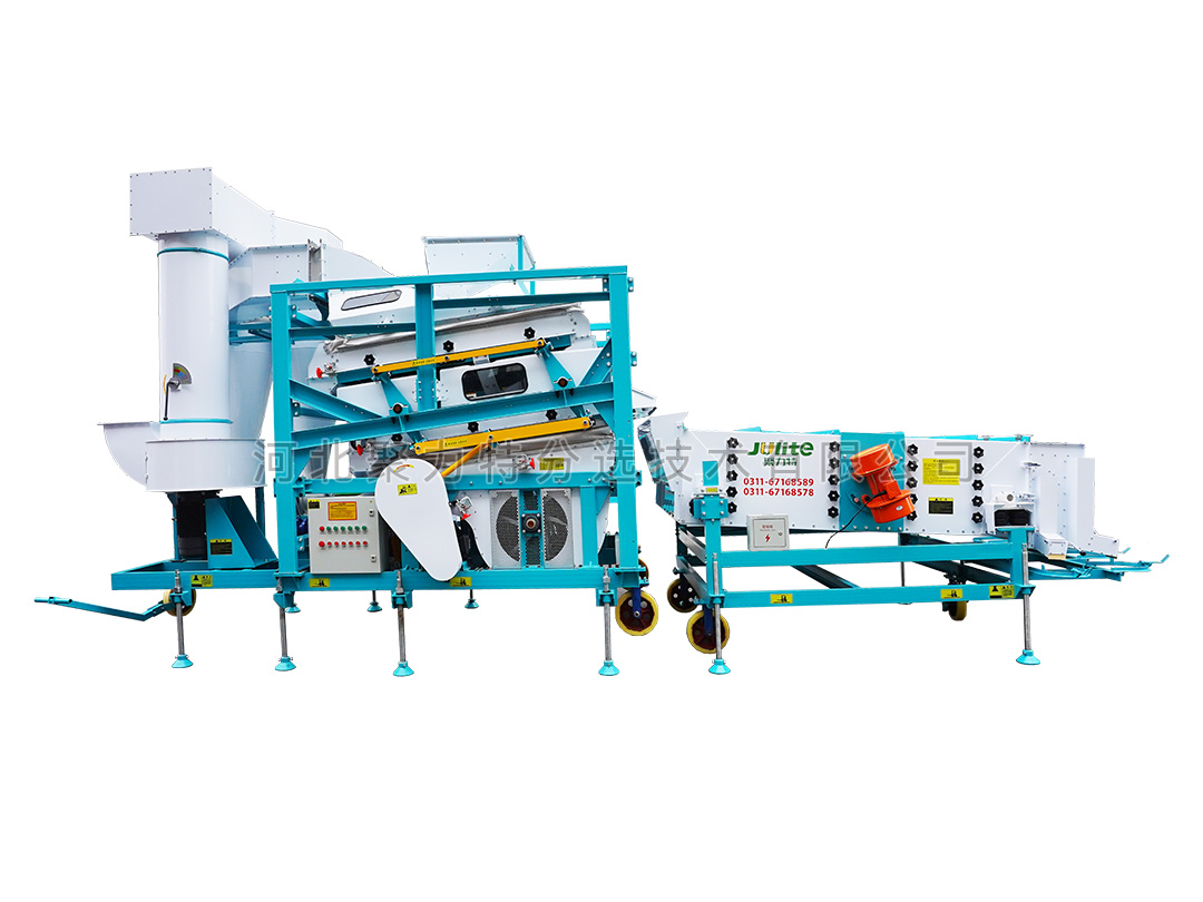 高粱篩選組合設(shè)備由雙體脫殼機(jī)、低速無破碎提升機(jī)、復(fù)式比重清選機(jī)、雙篩箱振動篩組成。