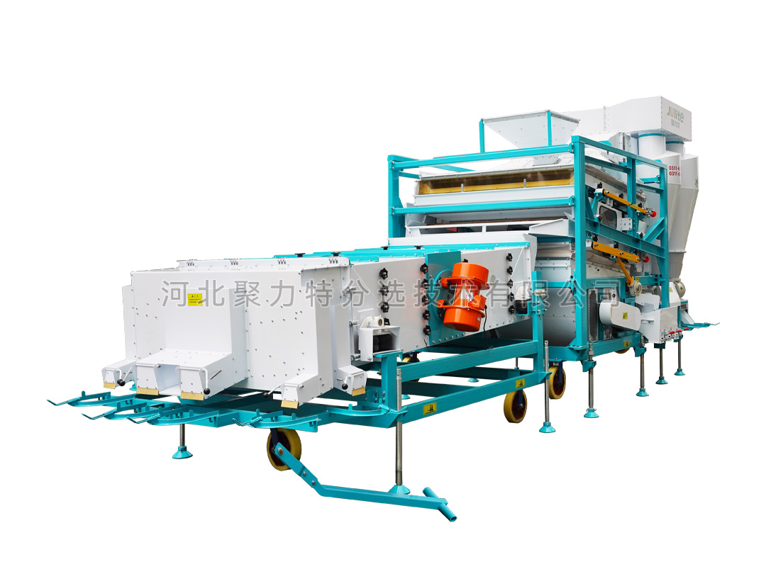 物料通過提升機(jī)經(jīng)喂入斗進(jìn)入第一道負(fù)壓比重臺,通過風(fēng)選去除物料中的粉塵、糠殼等輕雜質(zhì),輕雜經(jīng)風(fēng)道、旋風(fēng)除塵器,由閉風(fēng)器排出;通過比重選有效去除物料中的秸稈、軸芯等比重較輕的雜質(zhì)。然后物料通過導(dǎo)糧機(jī)構(gòu)進(jìn)入第二道正壓比重臺,通過調(diào)整風(fēng)量、擋板位置等進(jìn)行比重加工,去除物料中的碎粒、秕籽、芽粒、蟲蛀粒、霉變粒等雜質(zhì),比重后的物料,進(jìn)入雙篩箱振動分級篩,雙篩箱同時加工,有效去除大雜、小雜、碎粒、瓣粒等雜質(zhì)。